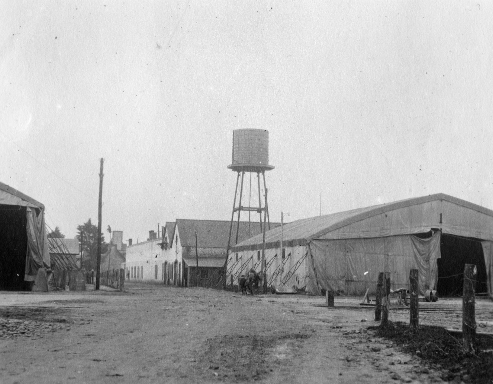 Vue de la Naval Air Sation de l'Île-Tydy : elle abritait des hydravions dans ses hangars, 1918 (collection : Naval History and Heritage Command, UA 80.02.38). Au centre, le château d'eauImmatriculation
