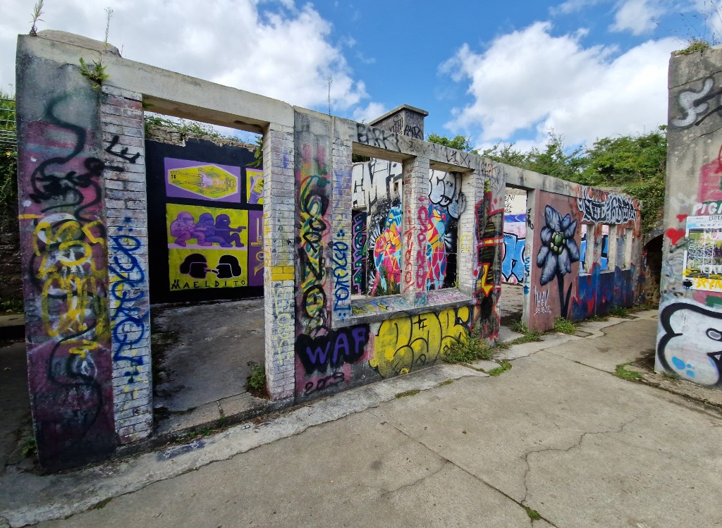 Vue de l'un des logement pour les soldats et de la cuisine (état en 2024). Les murs sont régulièrement taguésImmatriculation