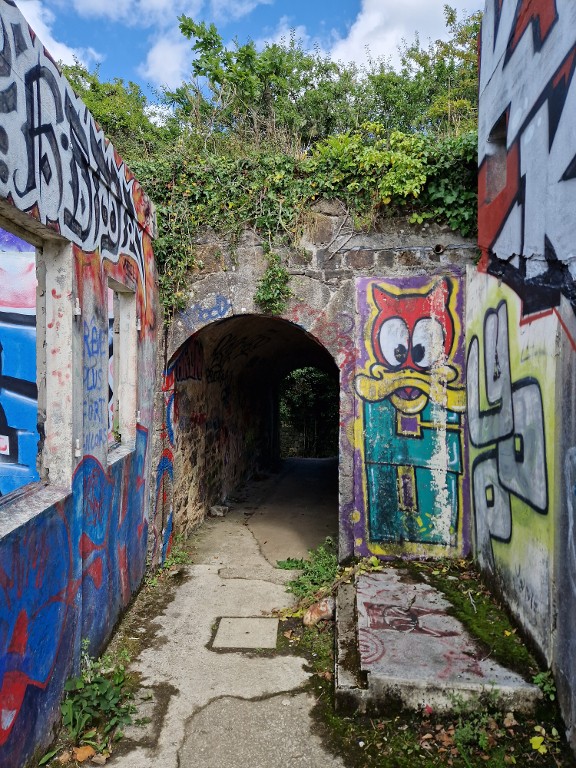 Vue de la poterne depuis la cour de la redoute (état en 2024). Les murs sont régulièrement taguésImmatriculation