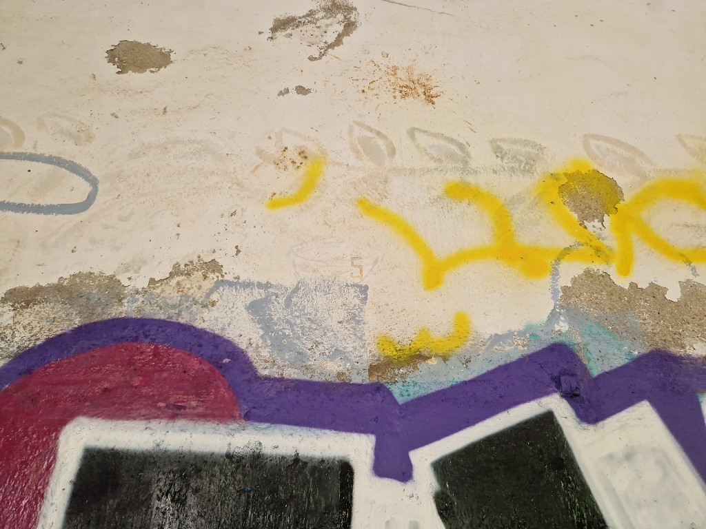 Vue intérieure de l'usine électrique du poste photo-électrique : peintures française (numérotation des hamacs de la batterie d'artillerie antiaérienne) et allemande (décor du réfectoire) (état en 2024)Immatriculation