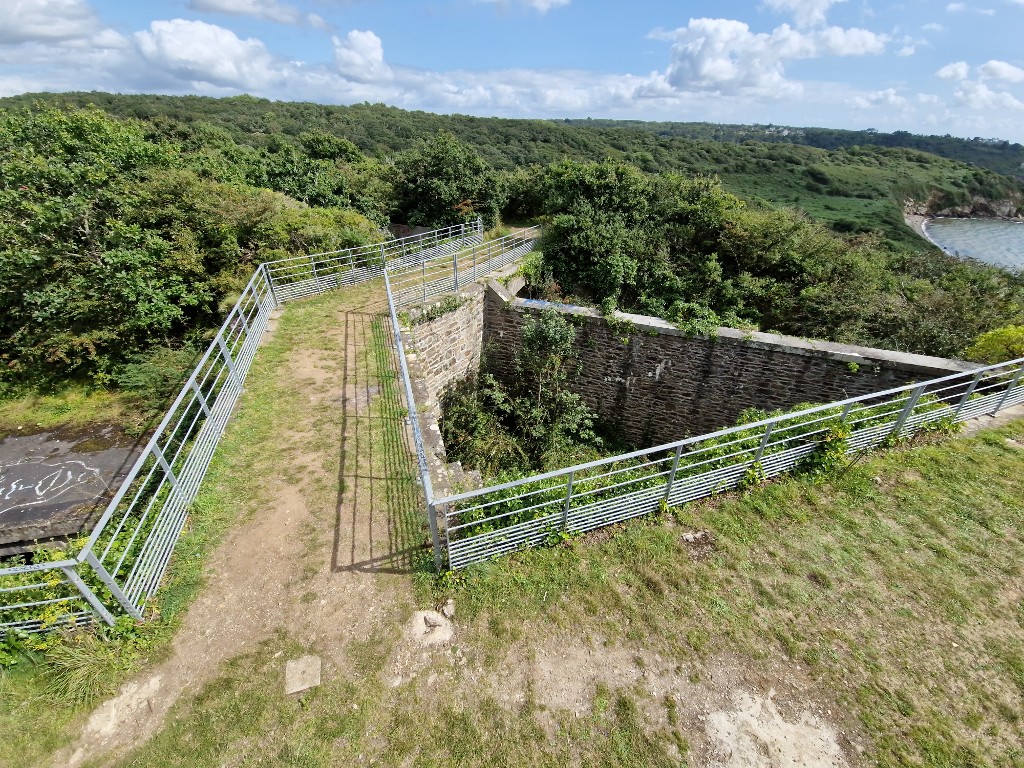 Vue des deux ponts d'accès à la redoute avec leurs garde-corps en acier galvanisé depuis la dalle de couverture du poste de commandement de groupe d'artillerie (état en 2024)Immatriculation