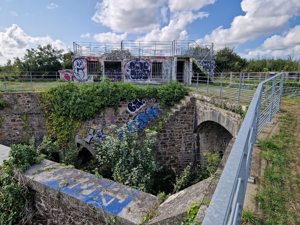 Vue des deux ponts d'accès à la redoute et du poste de commandement de groupe d'artillerie avec leurs garde-corps en acier galvanisé (état en 2024). Des escaliers permettent d'accèder dans la cour située en contrebasImmatriculation