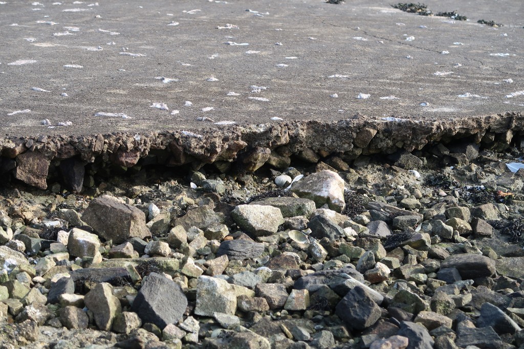 Vue de détail de la partie supérieure : dégradation du béton armé de la couche supérieure et de la maçonnerie par l'érosion marineImmatriculation