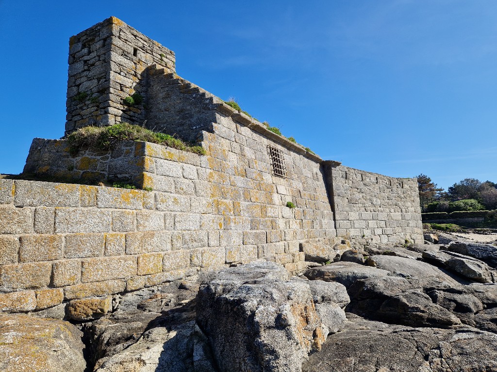 Vue du mur de soutènement en pierre de taille de granite : élévation sud-est (état en 2024). De ce côté se trouve le corps de garde avec guérite et magasin à poudre ; le mur de clôture - ici le demi-bastion sud - est doté de créneaux de fusilladeImmatriculation
