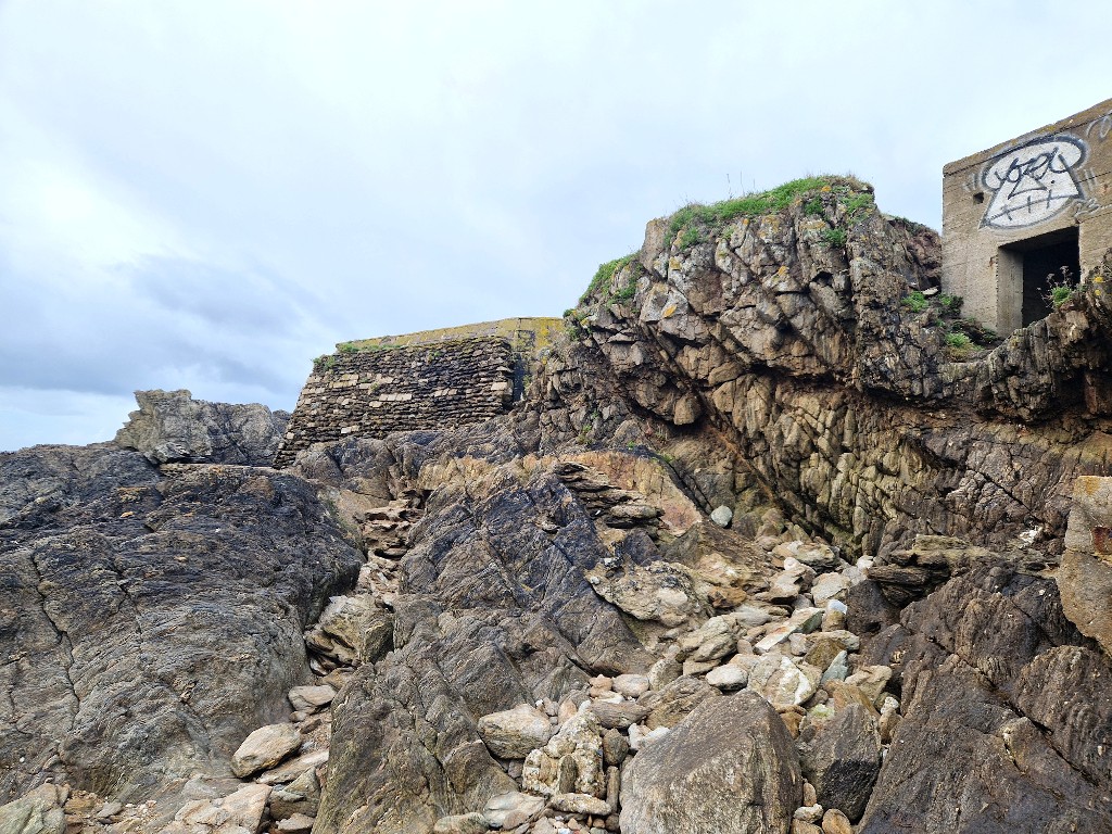 Vue de situation (du côté de l'entrée du bunker vers l'est). De ce côté de l'îlot, l'érosion marine est forte. Derrière la maçonnerie de moellon se cache le bunker - abriImmatriculation