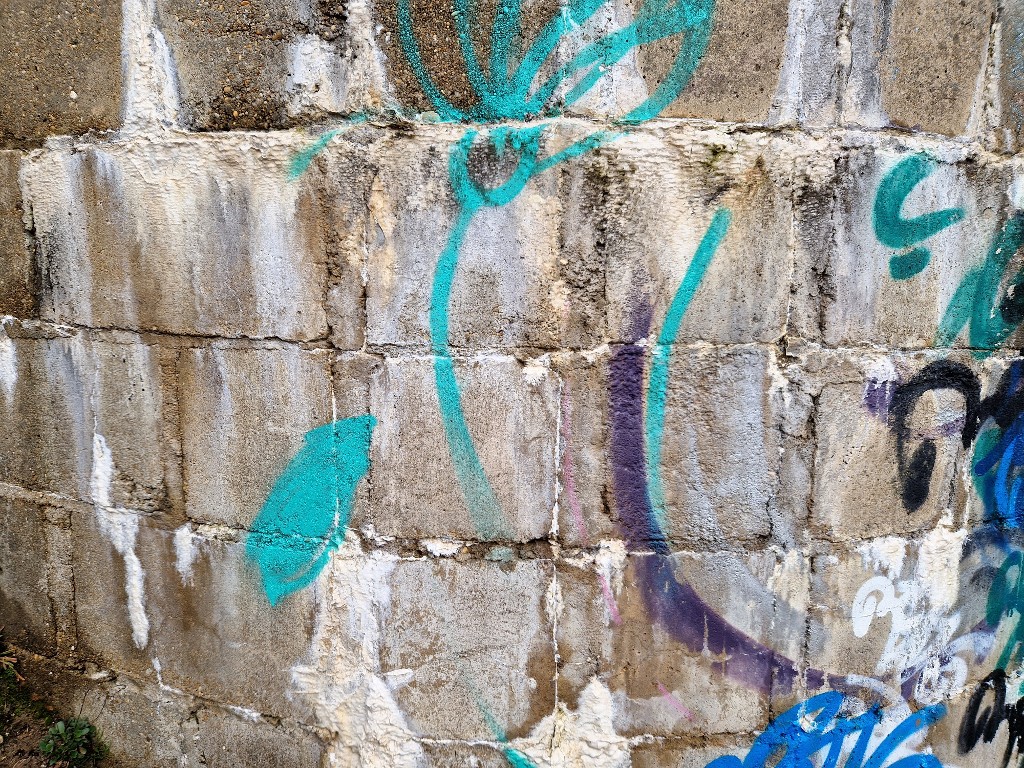 Vue de détail au sud-est. Le bunker est construit avec des parpaings dans lesquels a été coulé le béton. Il est taguéImmatriculation