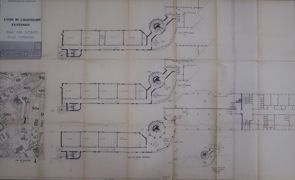 Extention : plan de situation et plans des niveaux. Jean-Pierre Huéber, architecte, 1988.Immatriculation