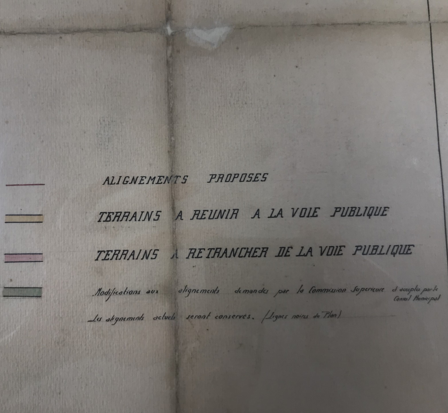 Détail de la légende du plan d'aménagement de 1928: une partie des alignements préconisés par l'ingénieur Troalen (préalablement en jaune) ont été colorés en vert pour les maintenir, après négociation avec la commission M.H.Immatriculation