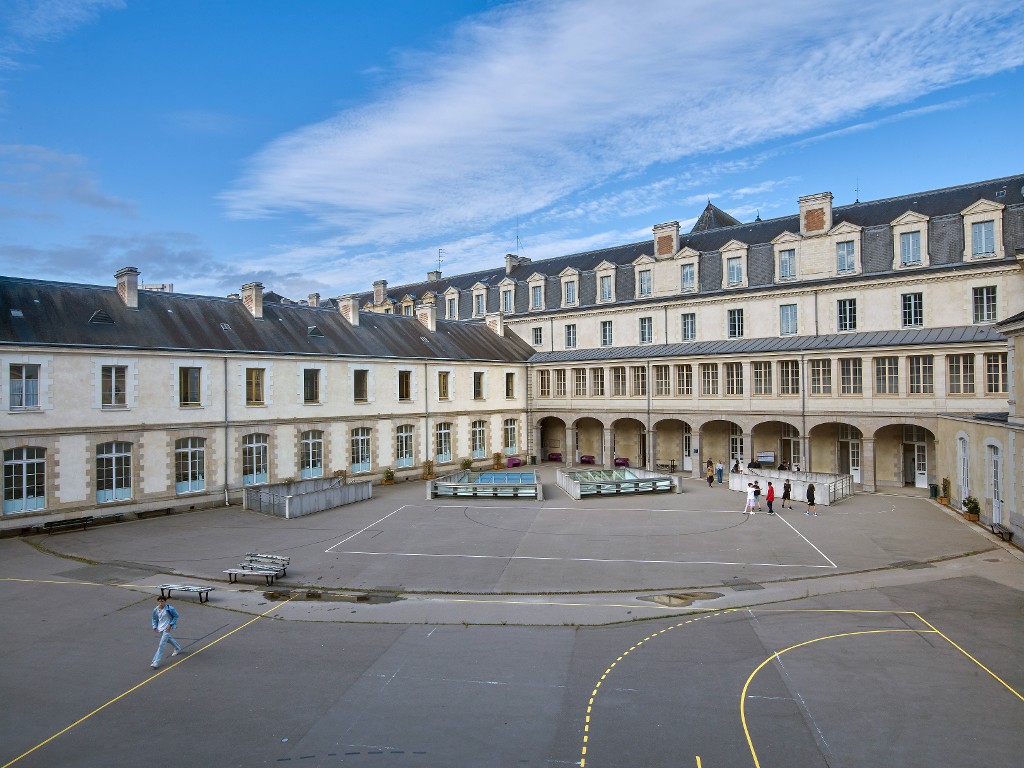 La 'cour des grands', après restructuration par J. Y. Gautier. La création d'un restaurant scolaire en sous-sol, délimité par la ligne courbe, n'a pas impacté la vue sur les façades due J-B. Martenot.Immatriculation