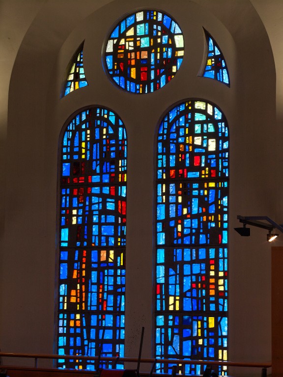 Vitraux de la chapelle, créés par Gabriel Loire (1964), en remplacement des vitraux détruits pendant la Seconde Guerre mondiale.Immatriculation