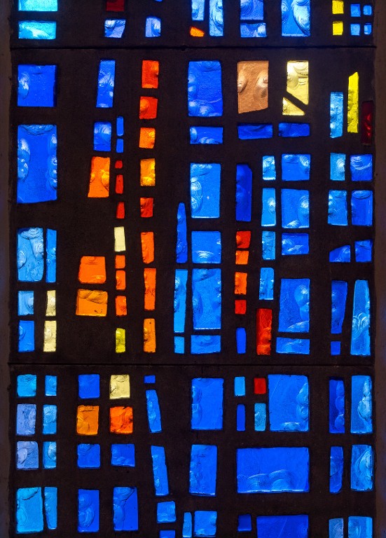 Vitraux de la chapelle (détail), créés par Gabriel Loire (1964), en remplacement des vitraux détruits pendant la Seconde Guerre mondiale. Noter les éclats qui adoucissent ou accentuent la lumière.Immatriculation