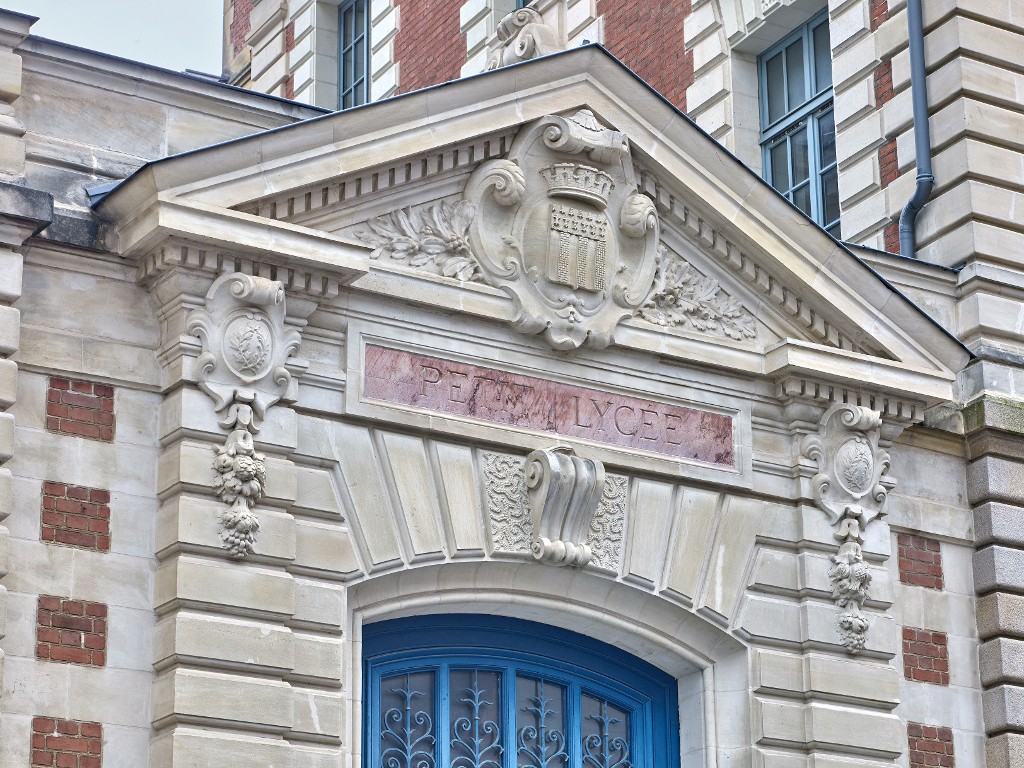 Fronton de l'entrée du 'petit lycée'. J-B. Martenot, architecte.Immatriculation