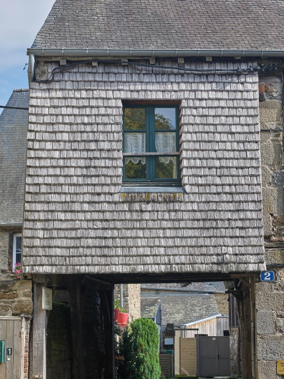 Le porche en pan de bois, caché sous des essentes en bois, vu depuis la rue.Immatriculation