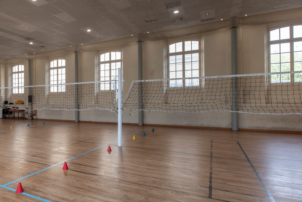 Rez-de-chaussée de la salle de sport aménagée dans l'ancienne salle des fêtes (Joël Y. Gautier, architecte).Immatriculation