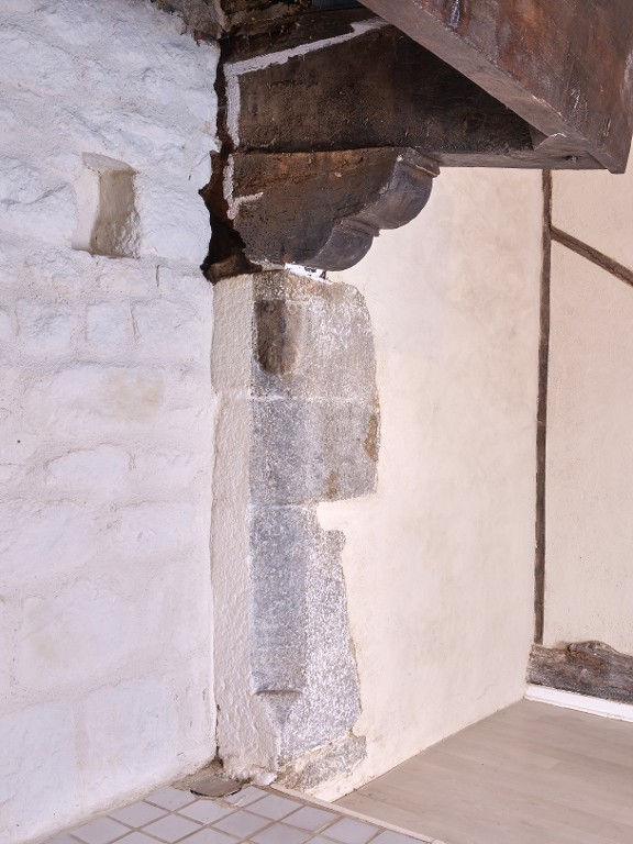 Logis principal. Chambre ouest de l'étage. Cheminée sur le pignon ouest. Détail du jambage chanfreiné, orné d'un visage barbu dans la partie supérieureImmatriculation