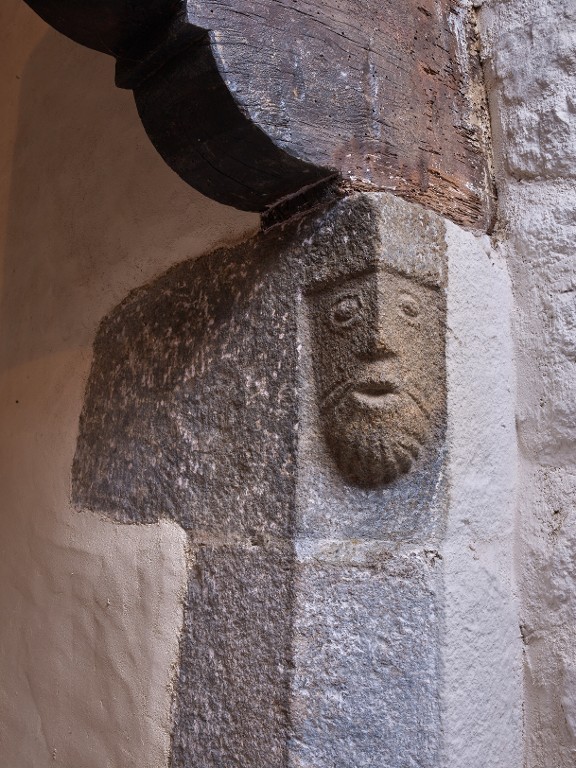 Logis principal. Chambre ouest de l'étage. Cheminée sur le pignon ouest. Détail d'un jambage avec visage barbu sculpté dans la partie supérieureImmatriculation