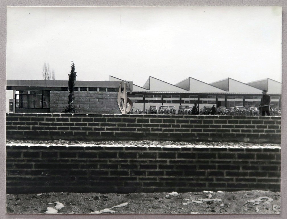 Francis Pellerin, photomontage : la maquette de la sculpture 'Allégresse' sur le site d'implantation future (vue de situation depuis la rue), vers 1962.Immatriculation