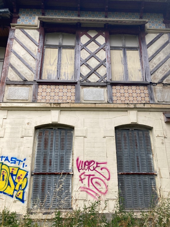 Façade sud : détail du décor de grès (état en 2024)Immatriculation