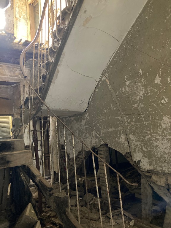 Vue intérieure avec détail de la rampe (rez-de-chaussée, au centre de la bâtisse) (état en 2024)Immatriculation
