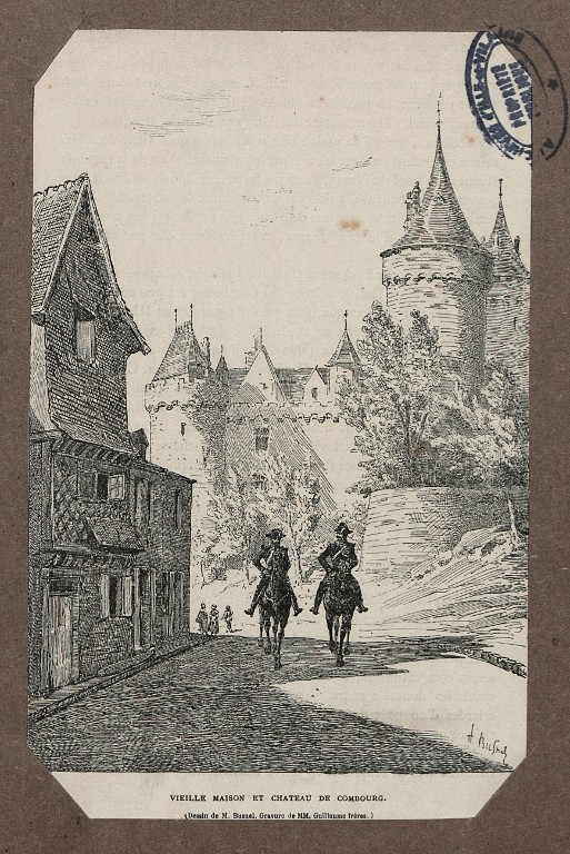 Deux cavaliers remontant la rue de la Beurrerie avec le château en arrière plan et une maison en pan de bois à gauche (fin 19e siècle).Immatriculation