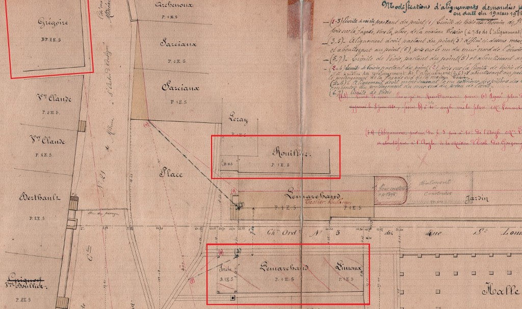Extrait du plan d'alignement de 1884 avec une mise en évidence de deux porches et de l'auberge de la Maison Rouge.Immatriculation