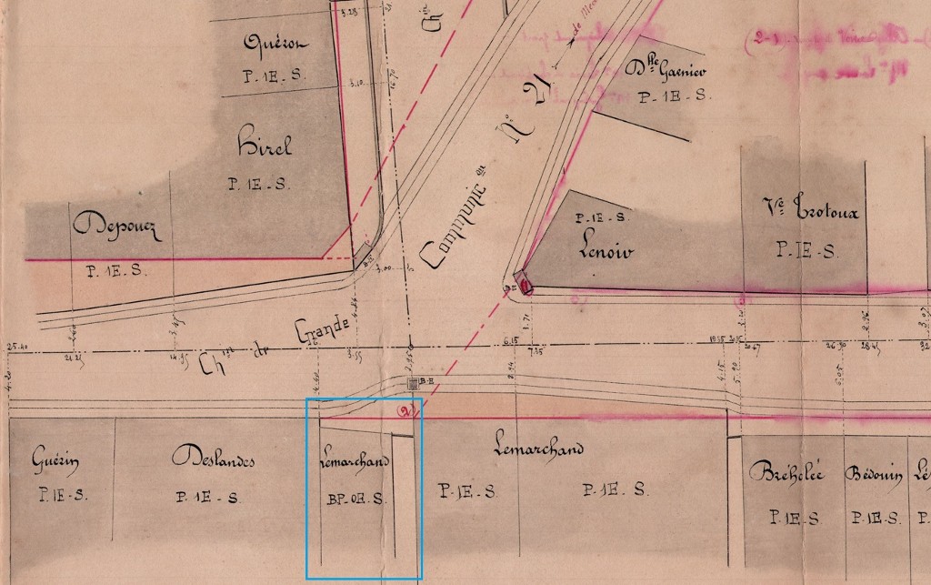 Extrait du plan d'alignement de 1884 avec une mise en évidence d'une maison en pan de bois construite au 19e siècle.Immatriculation