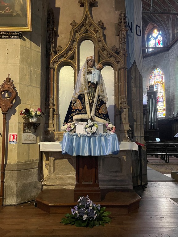 Vue de la statue habillée, placée sur son brancard, entre le transept et la chapelle nord de la basiliqueImmatriculation