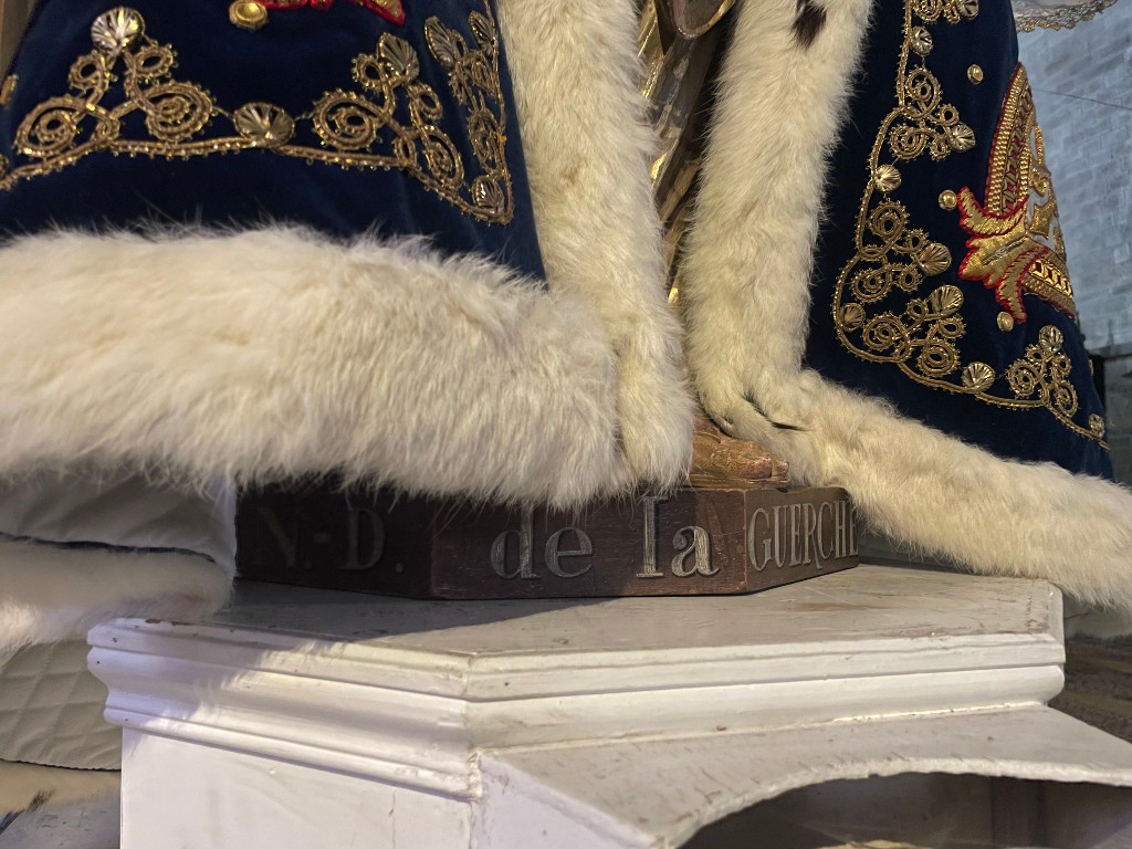 Détail du socle de la statue. Il est inscrit "N.-D. de la GUERCHE"Immatriculation