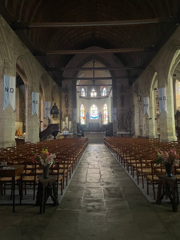 Vue d'ensemble de la nef et du choeur. Au mois d'août, les piliers sont décorés d'oriflammes aux couleurs de la ViergeImmatriculation