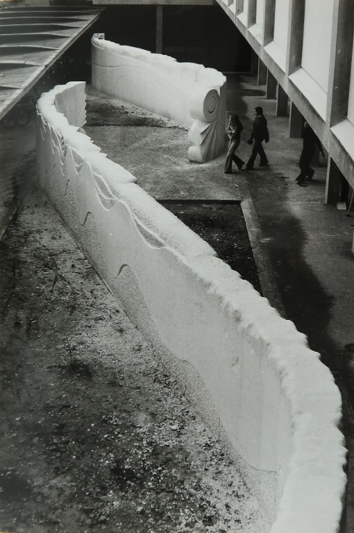 Yasuo Mizui, "Coupe-vent", mur sculpté en pierre de Lacoste, 1976, photographié peu après sa réalisation. Vue d'ensemble.Immatriculation