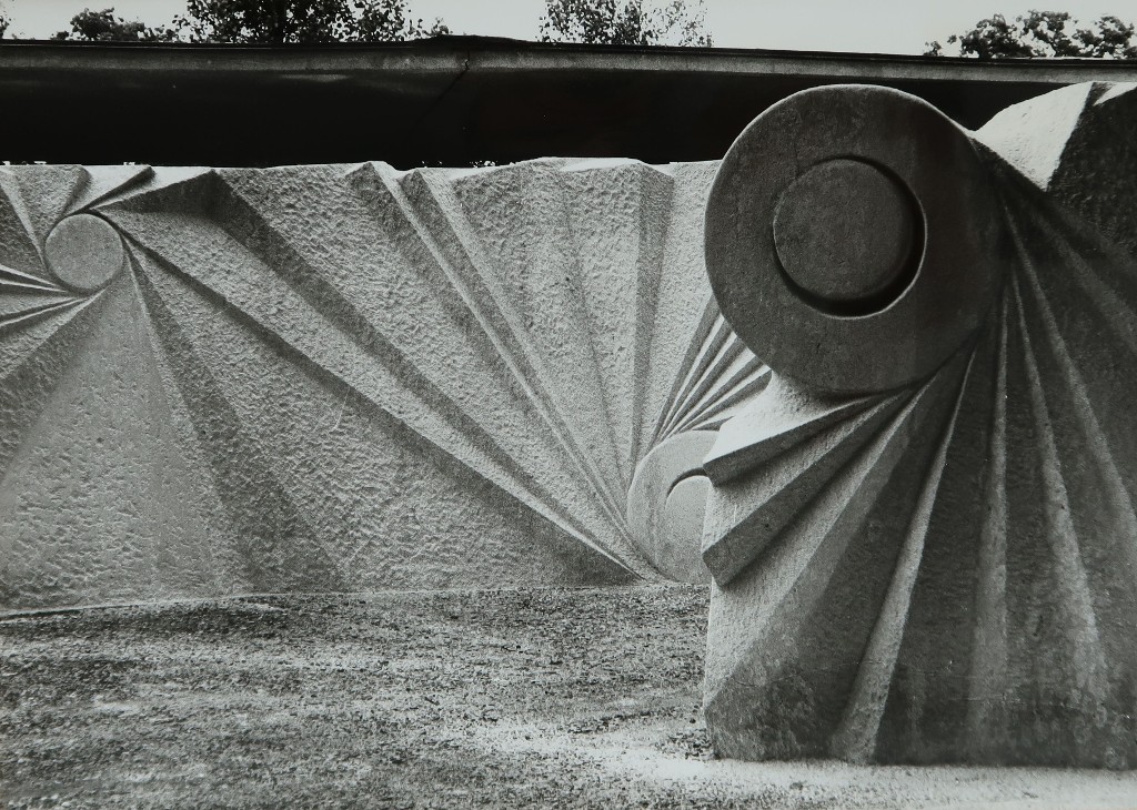 Yasuo Mizui, "Coupe-vent", mur sculpté en pierre de Lacoste, 1976, photographié peu après sa réalisation. Vue partielle.Immatriculation