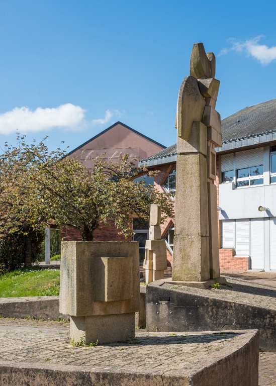 Michel Politzer, Espace sculpté, 1986 : Les trois "totems" en granite beige de Gourin et une partie du socle. Vue prise du nord-est.Immatriculation