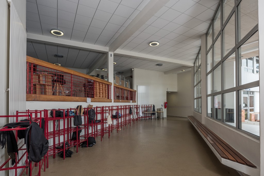 Hall - entrée : vue intérieure, noter la mezzanique en demi-niveau qui compense l'inclinaison du terrain. Patrick Pincemaille et Ruelland-Perche-Héraud, architectes, 1986.Immatriculation