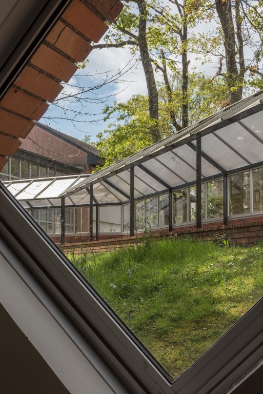 Vue sur la cour végéntalisée et la galerie couverte, à travers un hublot. Noter la conservation d'un talus, témoignage du paysage d'avant le lycée. Patrick Pincemaille et Ruelland-Perche-Héraud, architectes, 1986.Immatriculation