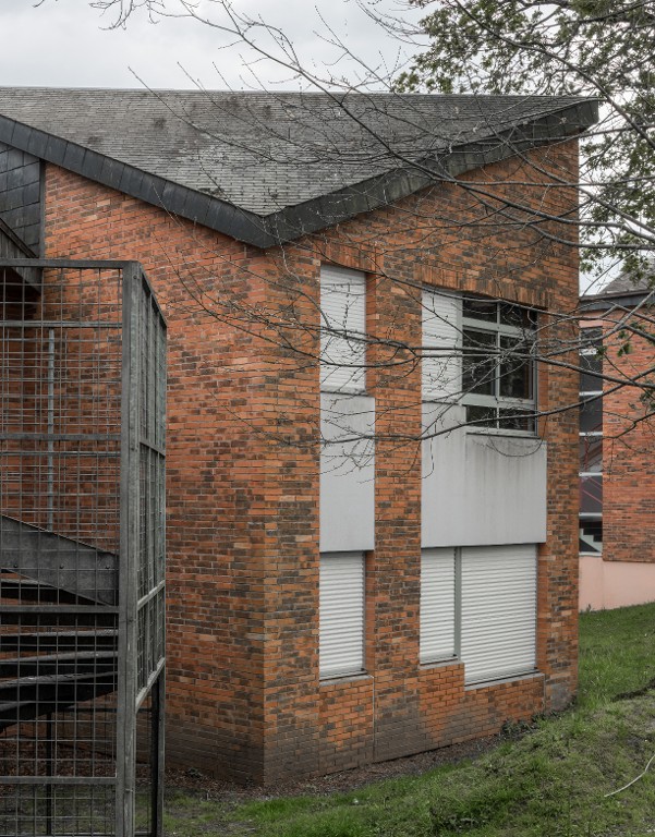 Outre la brique, l'ardoise est une des lignes fortes de l'architecture du lycée et un marqueur régionaliste. Patrick Pincemaille et Ruelland-Perche-Héraud, architectes, 1986.Immatriculation