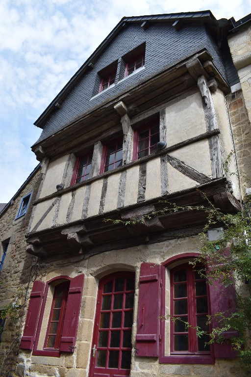 Façade en pan de bois avec encorbellement sur solives et essentage d'ardoises.Immatriculation