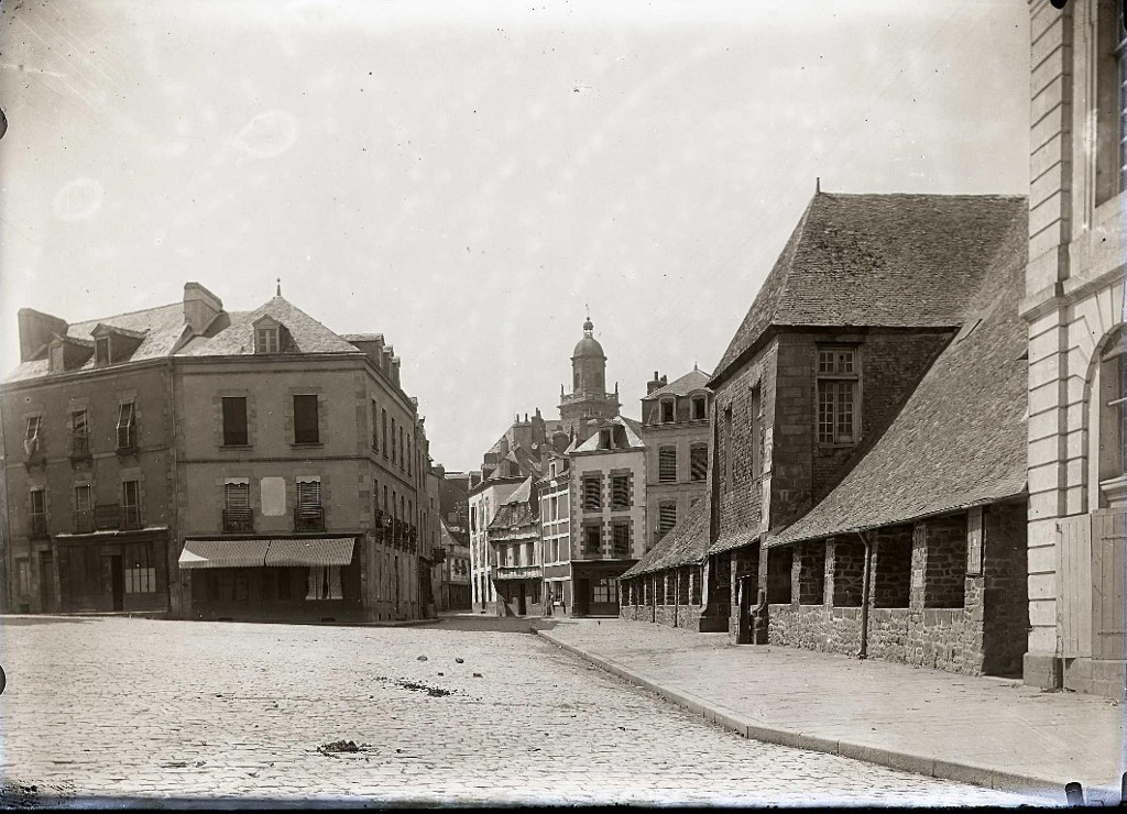 Place de la République, rue du Lait : les halles d'Auray. La maison en pan de bois est visible en arrière-plan.Immatriculation
