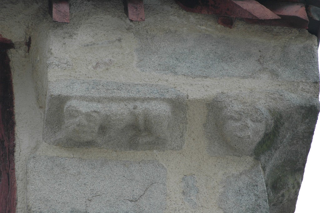 Etat de l'animal et de la figure humaine sculptés sur la corniche, rue du Docteur Alexandre Jardin (état en 2024).Immatriculation