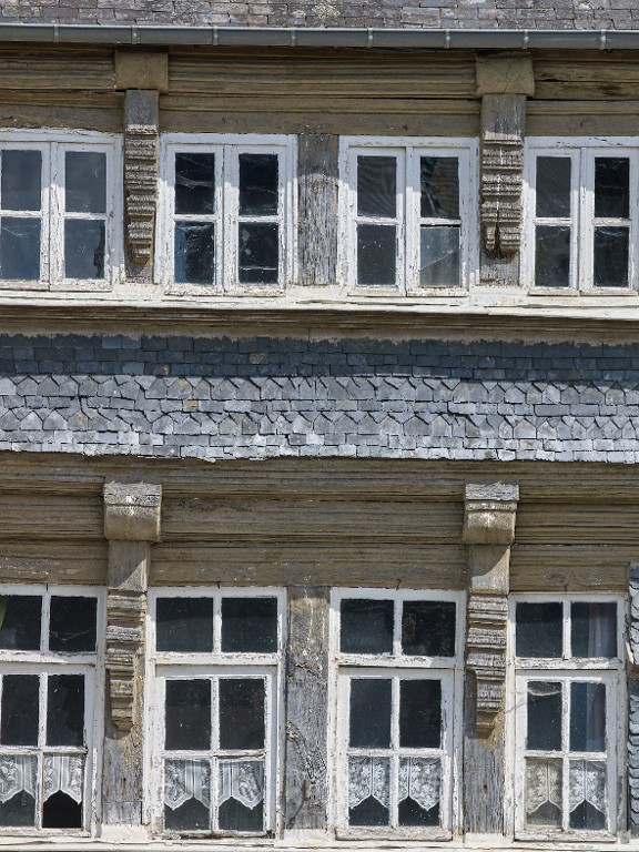 Pigeâtres sculptés sur les poteaux principaux de cette façade en pan de bois.Immatriculation