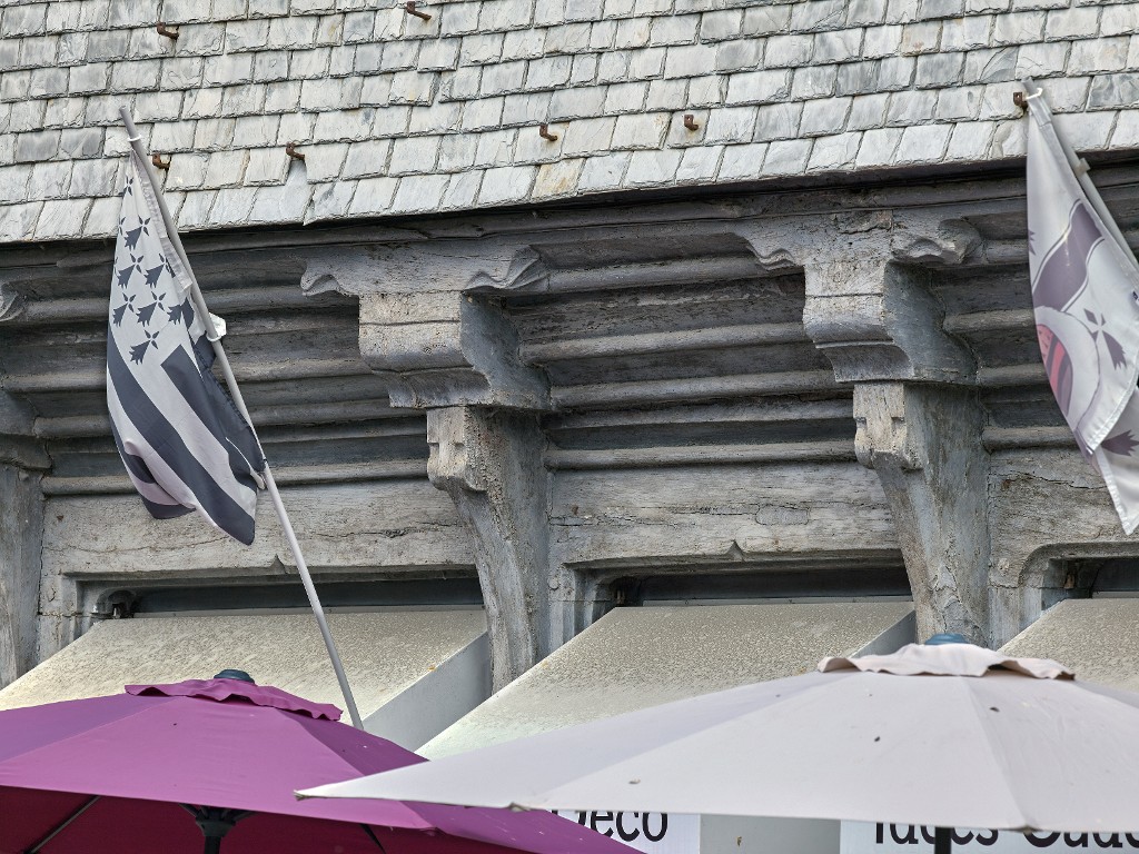 Différentes moulures animent l'encorbellement et soulignent les espaces entre chaque poteau et chaque solive.Immatriculation