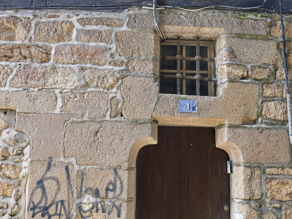 Porte à linteau sur coussinets surmontée d'une imposte, jouxtant une fenêtre à coussinets dans le gouttereau rue Jean-Jacques Rousseau.Immatriculation