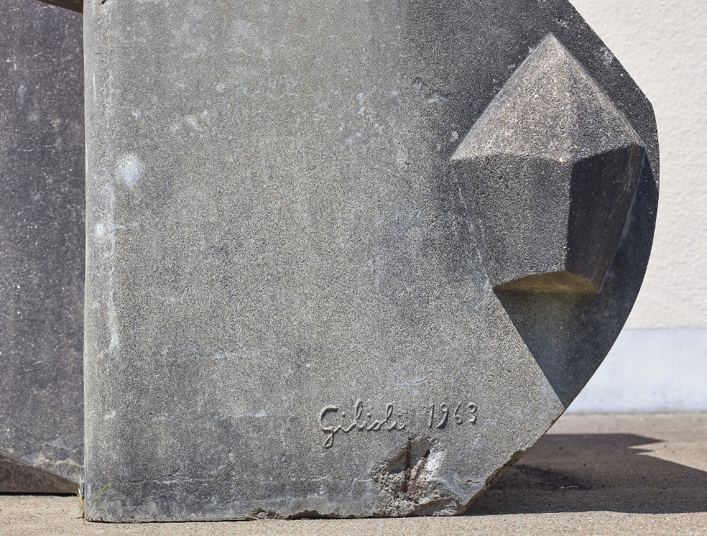 Émile Gilioli, sculpture en béton, 1963. Vue partielle de la partie basse, portant la signature de l'artiste et la date.Immatriculation