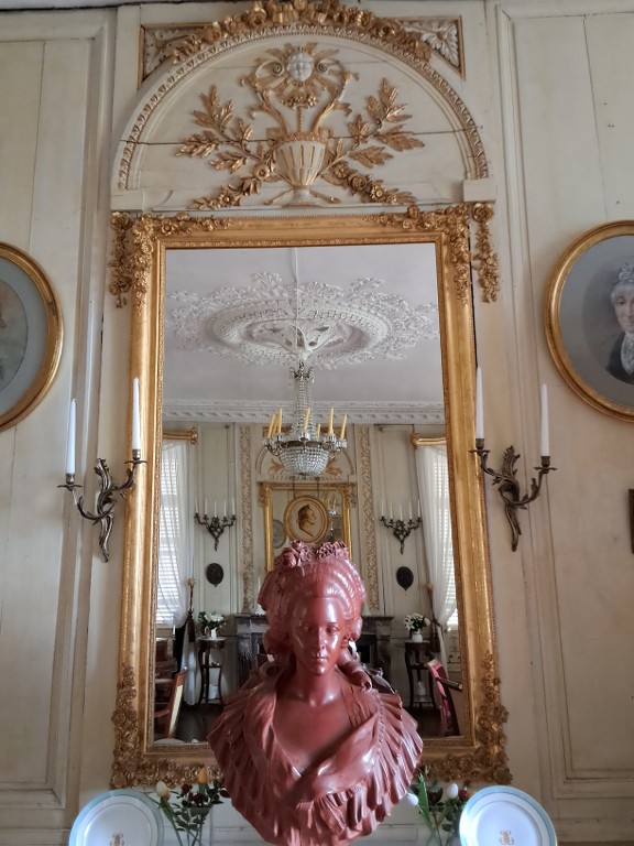 Grande salle de réception avec trumeau à glace et boiseries dorées aux attributs floraux avec une vasque et un soleilImmatriculation