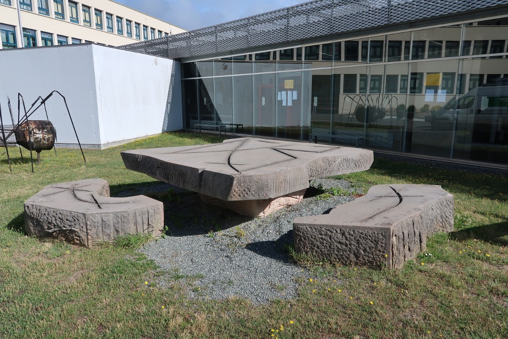 Groupe sculpté 'Grande table de conférence et bancs' d'Henri-Georges Adam (1967).Immatriculation