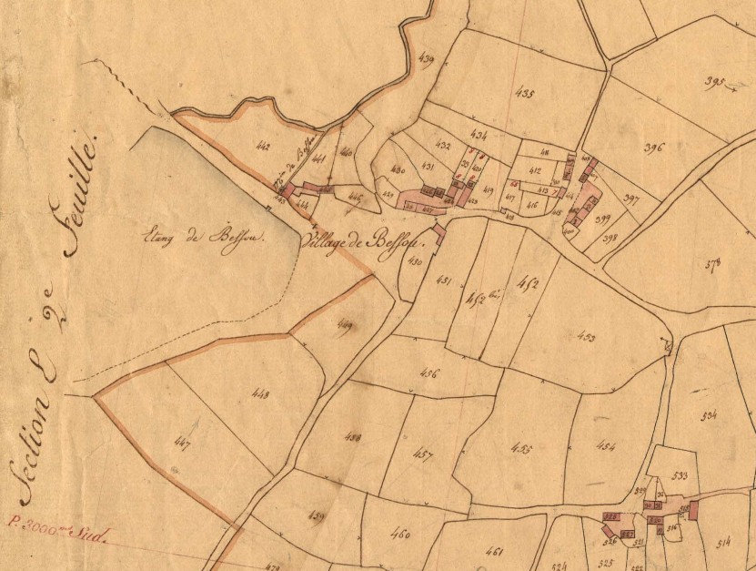Extrait du cadastre parcellaire de la commune de Plougras, section E dite de Beffou, première feuille, 1834 : étang et village de BeffouImmatriculation