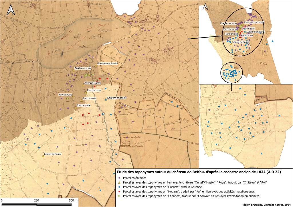 Plan de localisation des toponymes situés autour du château du Beffou d'après le cadastre parcellaire de 1834 conservé par les Archives départementales des Côtes-d'ArmorImmatriculation