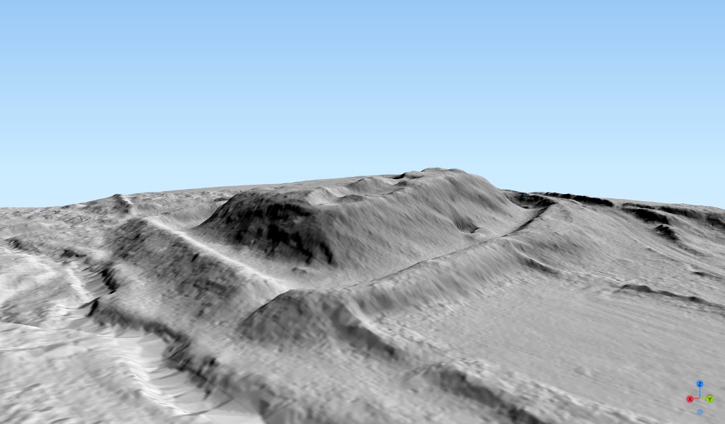 Plan en trois dimensions du château de Beffou depuis le nord-est à partir du Lidar HD de l'Institut national de l'information géographique et forestière. La plate-forme surélevée du château affecte une forme trapézoïdaleImmatriculation