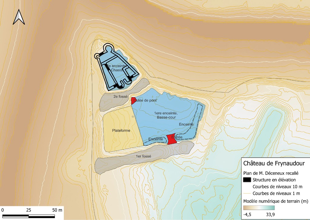 Plan interprétatif du château de Frynaudour sur fond RGE ALTI de l'Institut national de l'information géographique et forestière (rendu en courbe de niveau)Immatriculation