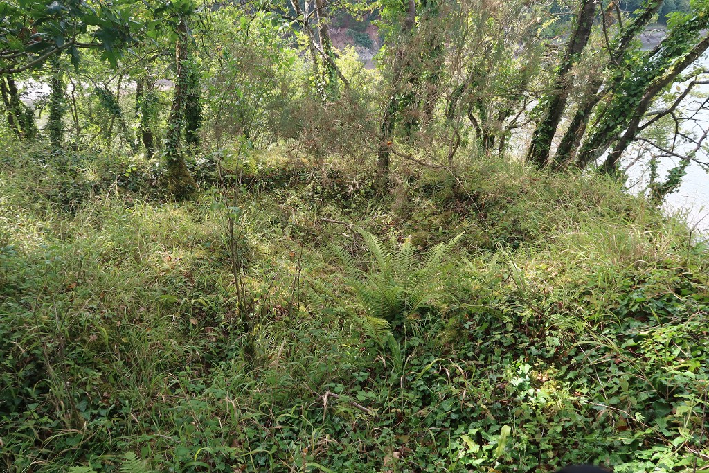 Vue des vestiges : mur en pierre maçonnée. Il s'agit vraisemblablement d'une tour circulaireImmatriculation