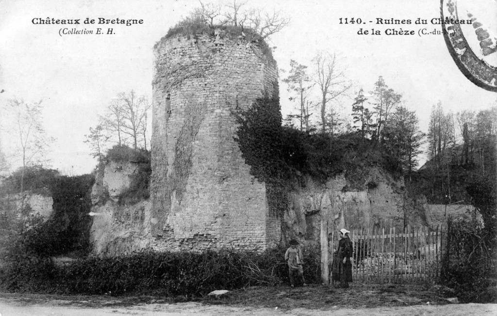 Vue du château de la Chèze depuis le nord (collection : Archives départementales d'Ille-et-Vilaine, carte postale, collection E. Hamonic, série : Châteaux de Bretagne). Au premier plan, la tour de plan octogonalImmatriculation